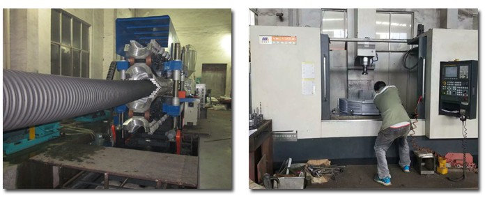 2. 擠出機(jī)頭:雙流道結(jié)構(gòu)、氮化磨光處理,口模的特殊設(shè)計(jì),適合不同材料、不同環(huán)剛度管材的生產(chǎn)。特殊的模具結(jié)構(gòu)保證了內(nèi)外層壁厚均勻和穩(wěn)定地成型。